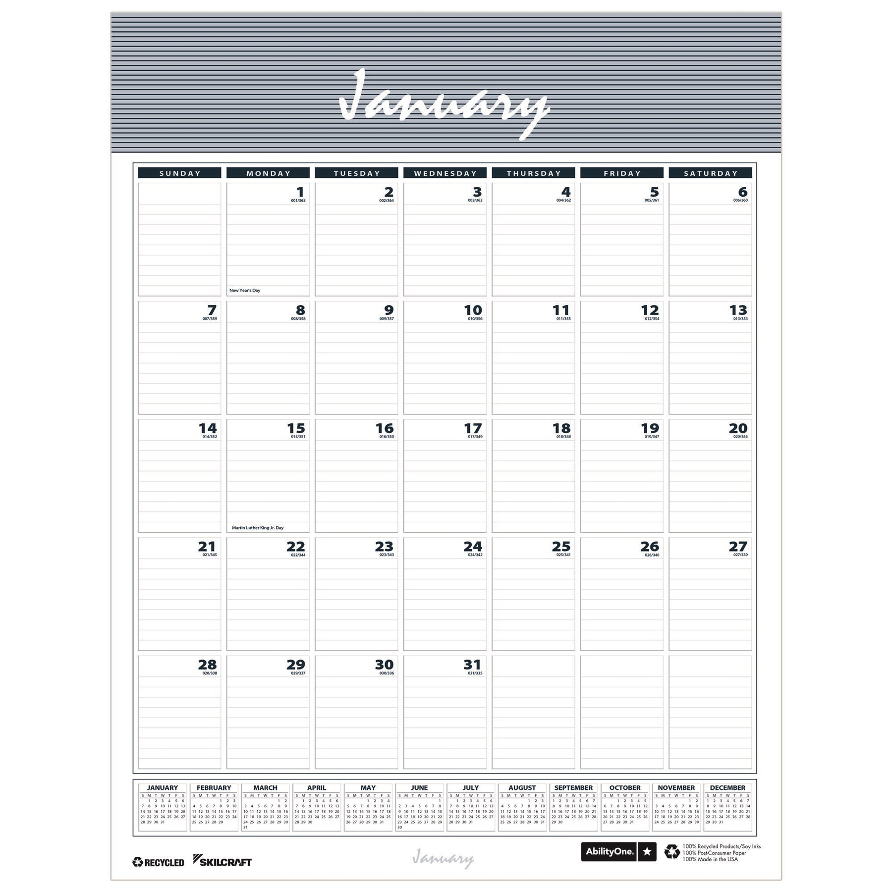 This wire-bound wall calendar includes a 12-month period from January through December, with each month printed on separate pages. Each daily square is ruled and contains both holidays and Julian dates. For reference, a 12-month calendar is printed at the bottom of each page. Paper is 100% post-consumer recycled paper and soy-based ink is used in printing. Edition Year: 2024; Dated/Undated: Dated; Calendar Format: Monthly; Page Format: One Month per Page.