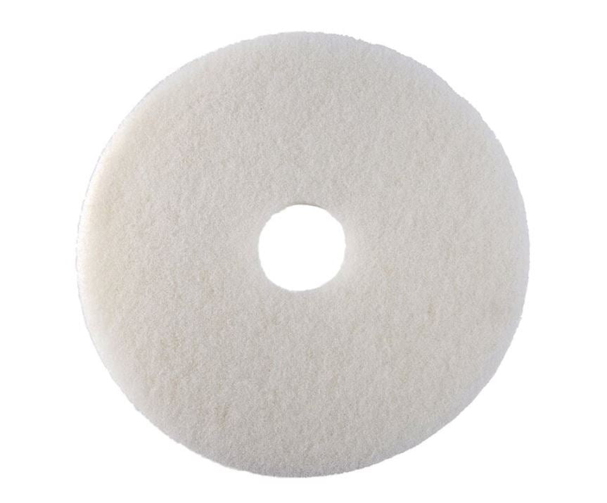 This 21" diameter White Polishing Floor Pad, part of the 4100 Series, is made with 3M™ floor pad materials to ensure durable, high-quality performance. It is specifically designed to buff and polish soft waxes on wood floors, and is suitable for use with speeds ranging from 175 to 600 rpm.