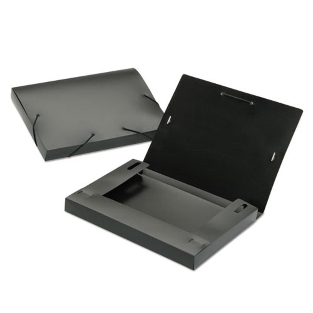 Easily organize your desk or stay organized on the go with the black expanding 1.25" file folder. This letter size folder includes clear dividers and two business card holders, and the opaque storage box securely stores documents and supplies. Its elastic band closure and portable design make it perfect for any situation. Keep documents, CDs, business cards, and a pen and notepad all in one place with this functional and efficient storage solution.