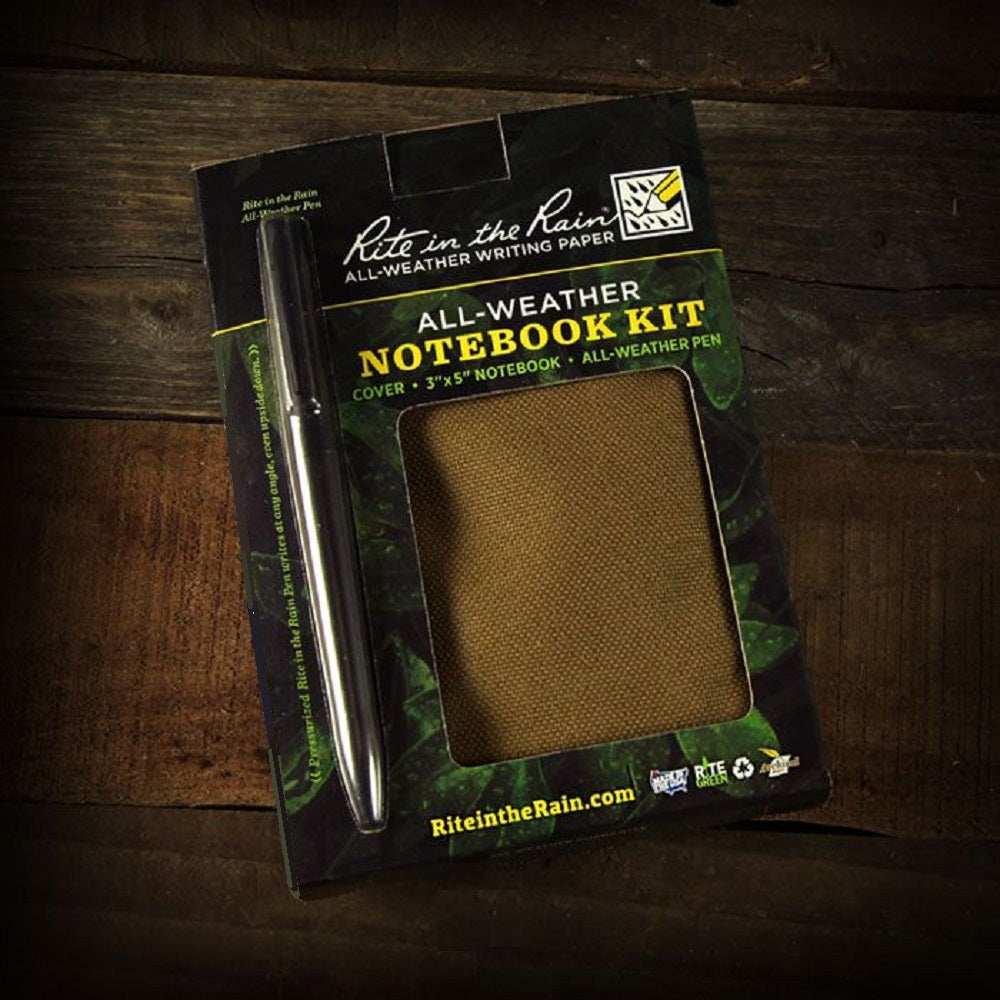 Package includes the All-Weather Tactical Field Book, All-Weather Tactical Black Clicker Pen, CORDURA tan fabric Cover. The tough Field-Flex cover will withstand the rigors of battle while fitting comfortably into your cargo pants pocket. Pages are printed on non-glare 32 lb Tan Rite in the Rain All-Weather Paper. Each sheet is perforated for easy removal. Use the Universal pattern for notes and scaled drawings. The book also contains 16 pages of tactical reference material, including: Sector sketch preparation, unit symbol charts, mission graphics, call for fire procedure and much more. 100 pages (50 sheets), 3 in x 5 in. While a pencil works great on our All-Weather products, sometimes you just need a pen. These All-Weather pens write on wet paper and upside down in temperatures from -30F to 250F. Flat black metal barrel.