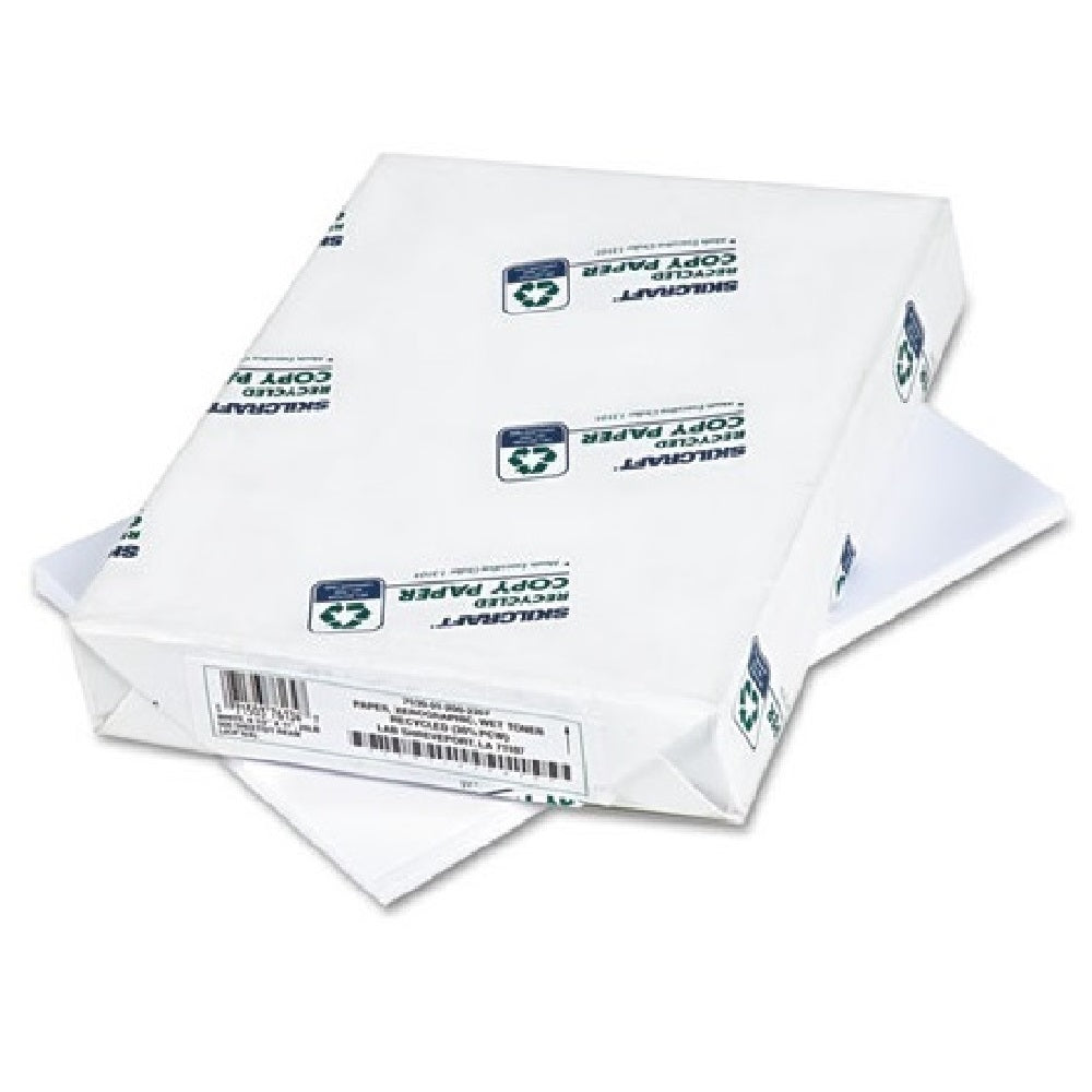 This paper is acid-free and suitable for archival use in wet toner processing. It has a 92+ brightness and is made from 30% post-consumer recycled materials. The paper is 20-lb and white in color, measuring 8-1/2" W x 11" L. It meets Executive Orders 13514 and 13423.