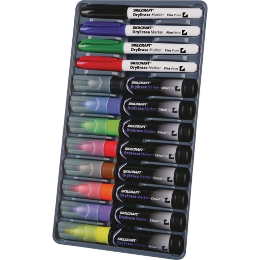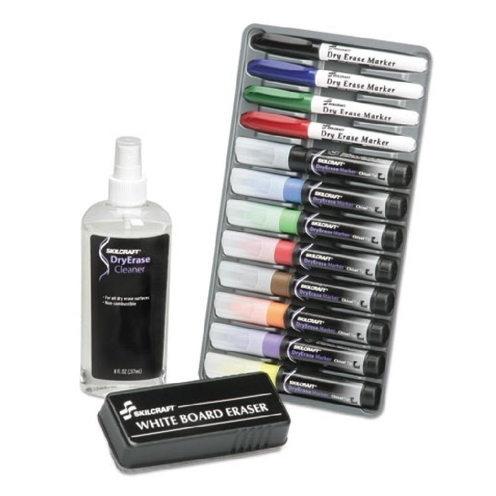 A comprehensive collection of tools, this system includes four low-odor, fine-point and eight chisel-tip dry erase markers, plus an eraser and 8-ounce board cleaner. Fine-point colors: black, blue, red and green; chisel-tip colors: black, blue, red, green, yellow, orange, brown and purple. All stored in a robust carrying case.