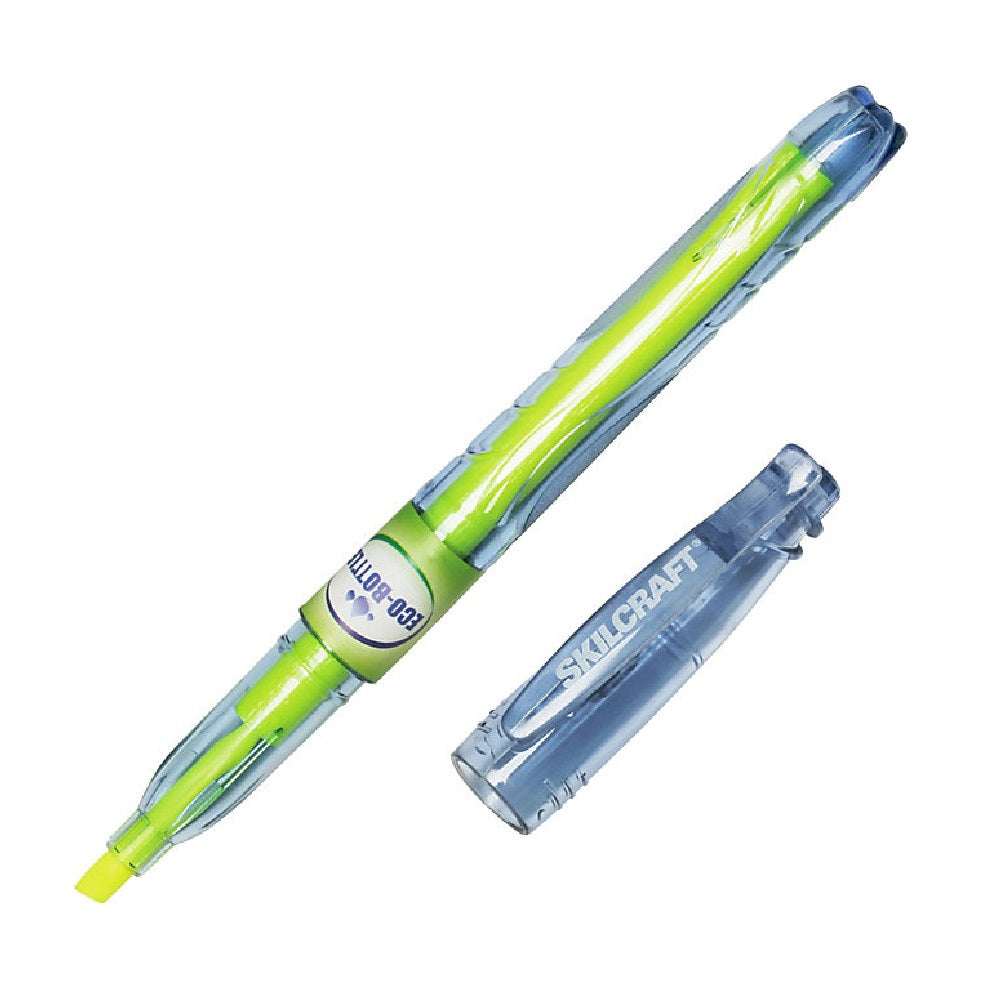 Skilcraft® Eco-Bottle Recycled Highlighter, Yellow Ink, Chisel Tip, Clear/Yellow Barrel, 1/Dozen. This premium highlighter is made using recycled materials, making it both environmentally conscious and cost-effective. An ideal choice for everyday use, this bright yellow highlighter ensures your writing will stand out.