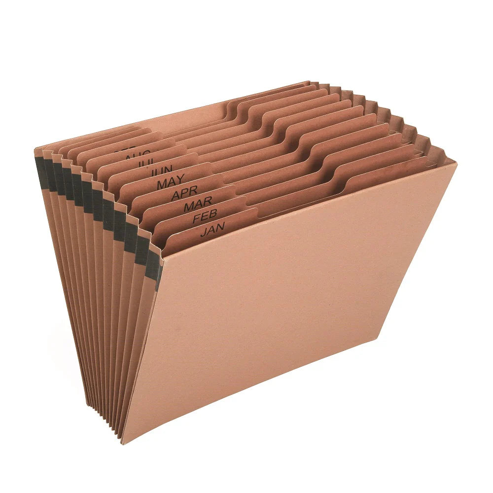 Stay organized throughout the year with the SKILCRAFT expanding file folder. Features 12 labeled tabs (JAN–DEC) to keep documents sorted by month. Constructed from heavy-duty kraft with reinforced siding for durability, each pocket expands to 7/8" to provide ample storage for critical paperwork. Ideal for offices and government environments requiring reliable long-term organization. TAA compliant and made in the USA through the AbilityOne Program, supporting jobs for people who are blind or have significant disabilities.