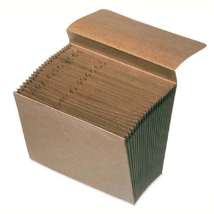 Skilcraft® Letter sized expanding accordion style pocket folder has 21 pockets for A to Z indexing. Covered with soil-resistant leather-patterned paper, this folder stands up to heavy handling. Folder expands to 15". Contains 30% post-consumer recycled content.