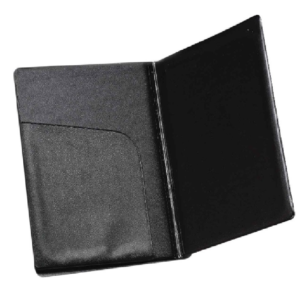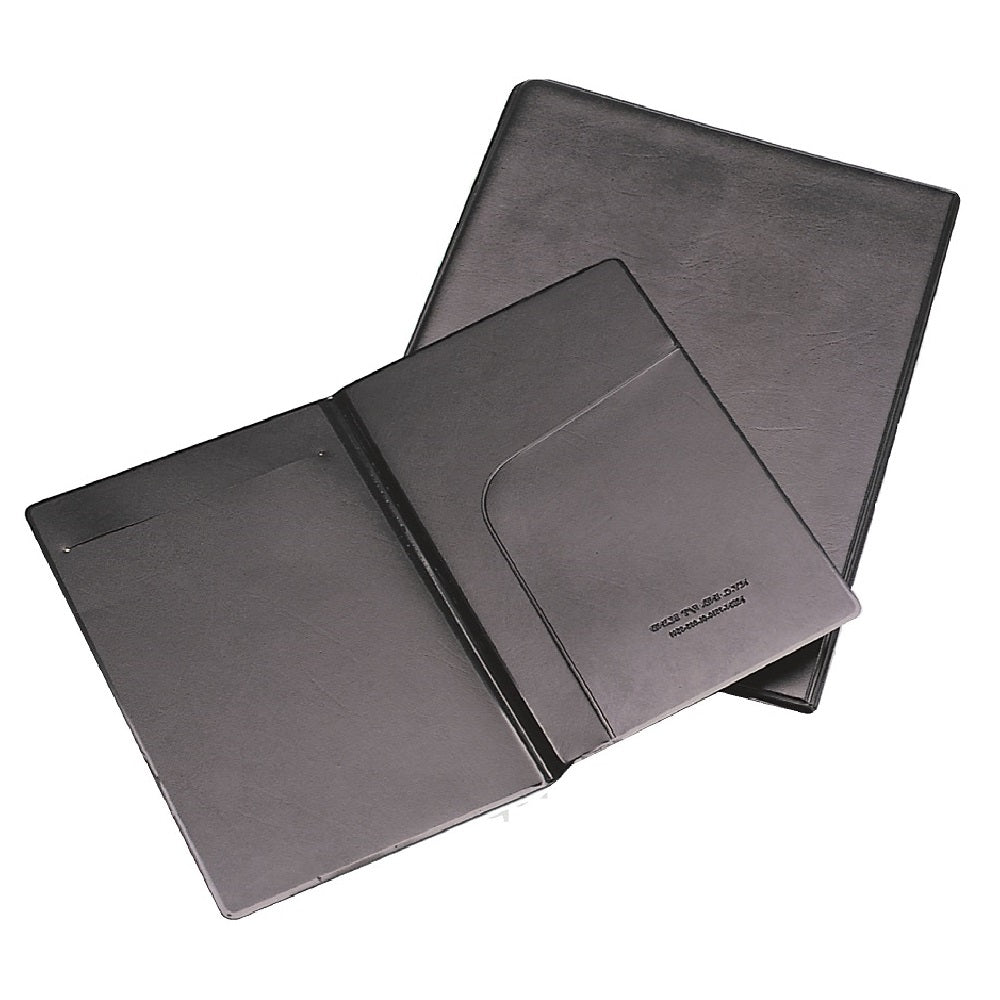 Skilcraft® Economy side-opening portfolio has a space for a writing pad (not included) and includes a document pocket. Simulated black leather-grain vinyl. Portfolio size is 6-1/8" x 9", fits 5" x 8" memo pad. Bound side measurement listed first.