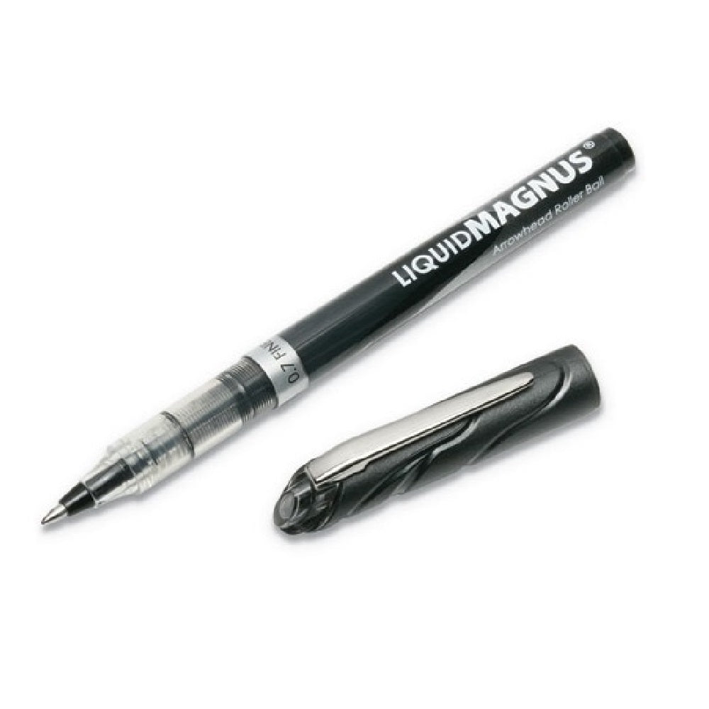 The Liquid Magnus™ Rollerball Pen contains water and fade resistant acid free liquid pigmented ink for the exceptionally smooth writing experience of a gel pen combined with the strength and durability of a ballpoint pen. Designed for precise writing even through carbon copies, these pens write with clean, distinct lines. Visible ink supply helps monitor ink levels over time. Color coded end cap includes flat metal clip.