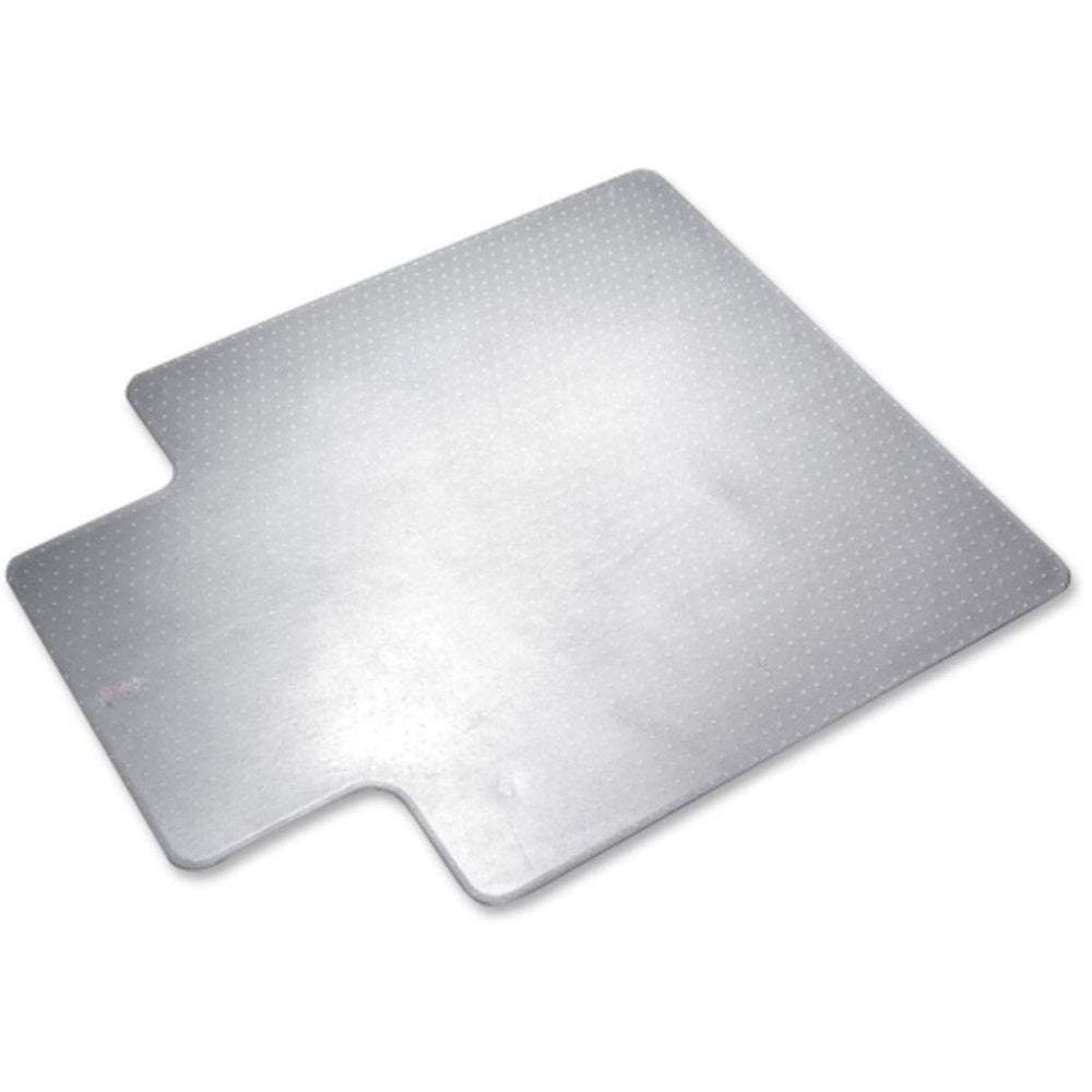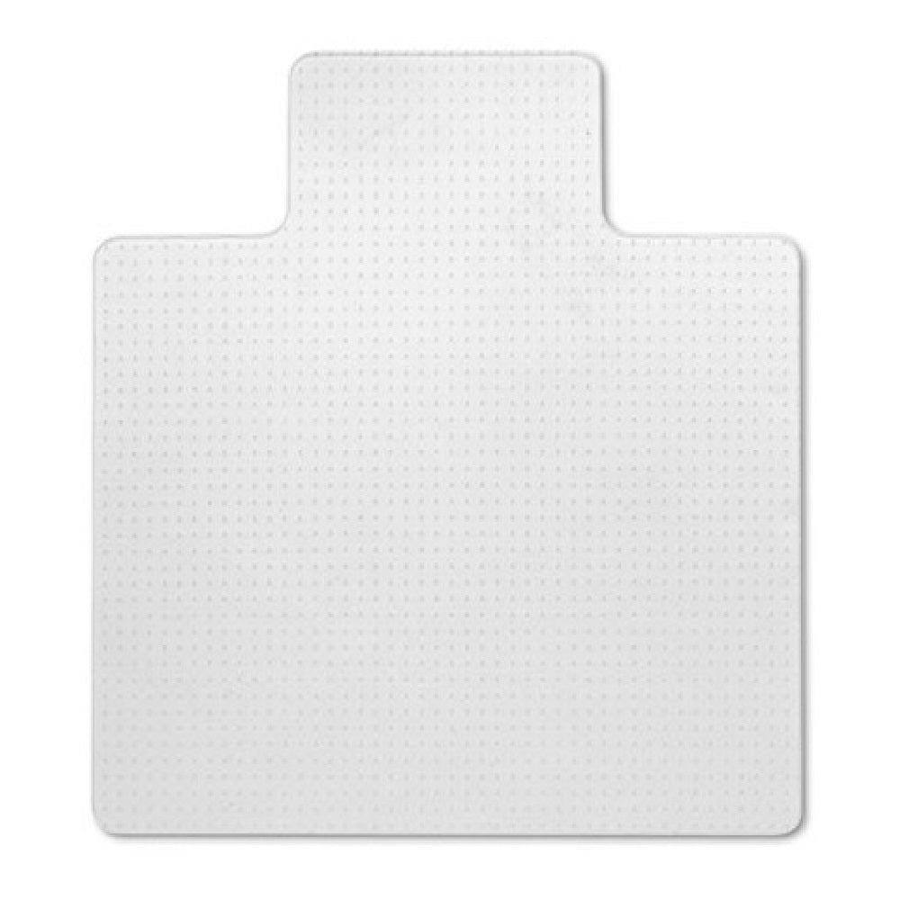 Transparent polyvinyl chloride (PVC) mat protects floors and carpets from wheel damage. Transparent color allows the carpeting to show through and the textured surface is scuff resistant. The stud design grips carpet but won't harm carpet. Mat is non-toxic and recyclable. Edges are beveled for easy roll on and off. Corners are rounded. For use on low to medium pile carpet. Overall dimensions include lip. Thickness is .145".