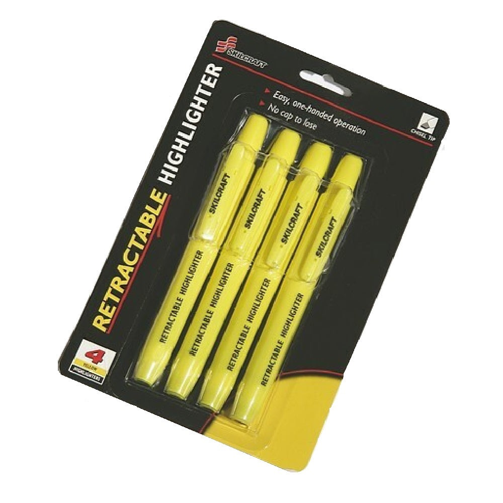 Skilcraft Retractable highlighters with an easy single-handed retractor operation eliminates the need for capping and re-capping while in use. Quick drying ink will not smear or leak. Bright neon colors to add emphasis to materials. Tip is made of durable polyester that holds its shape during marker use. Chisel tip designed to allow broad, medium and fine point highlighting. Handy pocket clip for portability and to prevent rolling. Safety clip protects against pocket leakage. Marker barrels and plungers are made using 50% pre-consumer recycled plastic. Retractable Highlighter, Chisel Point, Yellow Ink, 4-Pack, BPA free. An eco-friendly and reliable choice, these highlighters are ideal for classroom and office use, offering both maximal convenience and minimal waste.