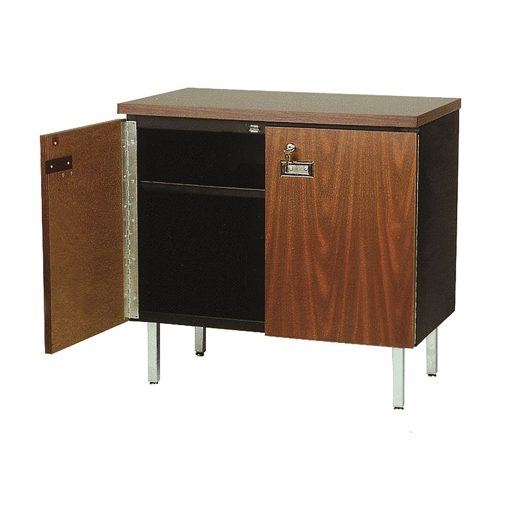 Constructed with a sturdy and durable steel exterior, coated with a baked on enamel finish for added protection. Topped with a laminated walnut surface, with the ability to adjust the shelf at 1/2-inch intervals. Features a key lock for secure storage. Chrome finish legs and door pull handles add a touch of modern elegance.