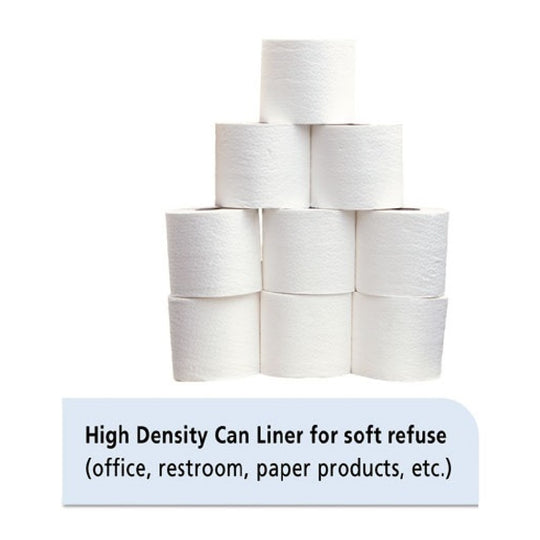 These Skilcraft® bags are used in soft refuse applications. Great for office, kitchen and bathroom applications. The high molecular weight of the high-density polyethylene resin produces an economical liner that is approximately one-third the weight of traditional can liners. The use of fewer raw materials returns less plastic to our environment. Great load-bearing capabilities. 38" x 60", 14 microns, 55 to 60-gallon capacity, loads up to 60 lbs, heavy-duty. AbilityOne Envision High-Density Can Liner, 38 x 60, Natural