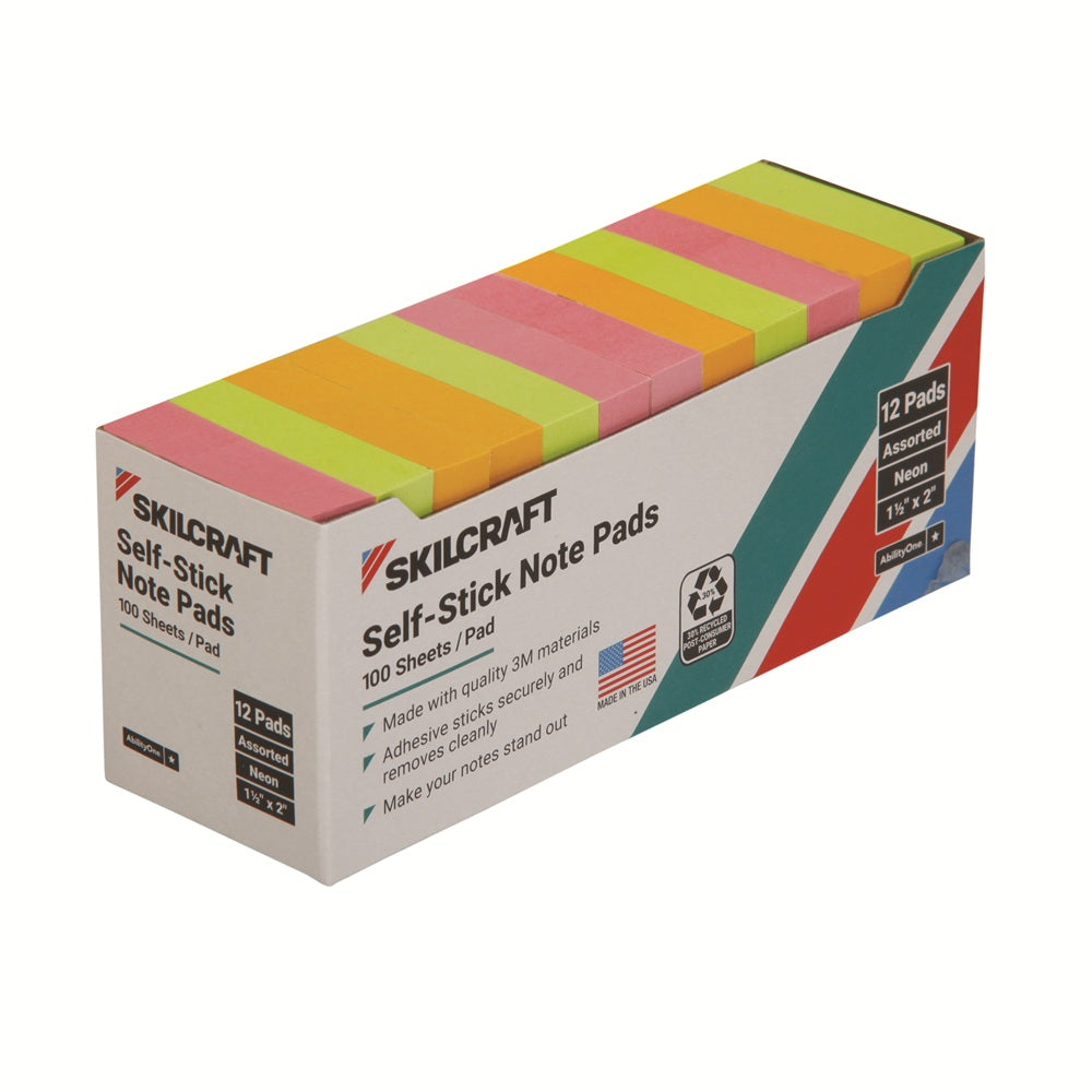 SKILCRAFT® Self-Stick Note Pads Are Made Using Quality 3M™ Materials and Designed for Reliable Adhesion on Most Surfaces. This Case of 36 Packs Is Ideal for Offices, Schools, and Facilities Requiring High-Volume Note and Labeling Solutions. Bright Neon Colors Improve Visibility, Remove Cleanly Without Marring, and Provide Consistent Performance Across Daily Tasks.