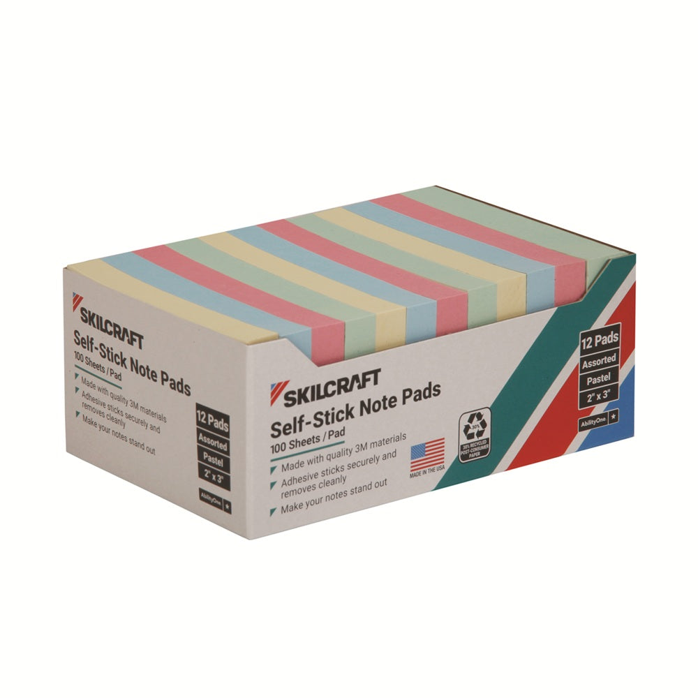 SKILCRAFT® Self-Stick Note Pads Are Made Using Quality 3M™ Materials and Designed for Reliable Adhesion on Most Surfaces. This Case of 144 Packs Supports High-Volume Office, School, and Facility Needs While Providing a Clean, Professional Look With Assorted Pastel Colors. Notes Remove Cleanly Without Marring and Deliver Consistent Performance for Daily Reminders, Labels, and Organization. Made With a Minimum of 30 Percent Post-Consumer Recycled Content and Fully Recyclable.