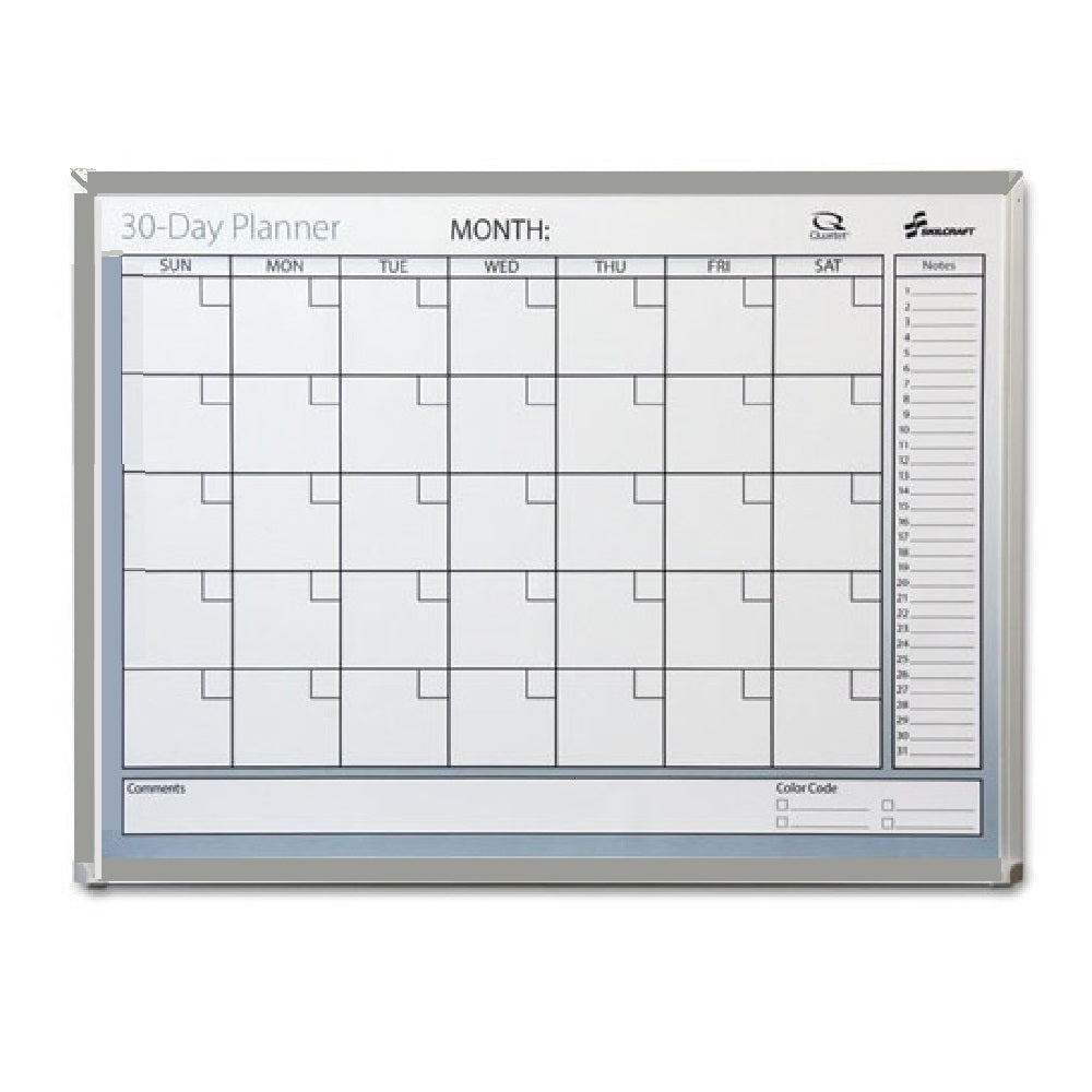 30-Day Dry Erase Control Planner Board Designed for Monthly Scheduling, Task Tracking, and Operational Planning in Offices, Command Centers, and Administrative Environments. Features a Laminated Mylar Writing Surface on Hardboard Backing with a Non-Dated 30-Day Layout, Daily Planning Blocks, and a Ruled Notes Section for Clear Organization. Satin-Finish Aluminum Frame Includes an Attachable Full-Length Accessory Tray with Protective End Caps for Marker and Eraser Storage.