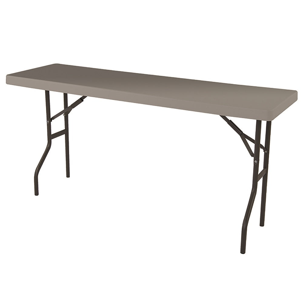 Expertly crafted and designed for commercial use, Skilcraft's Blow-Molded Folding Tables feature a stylish beveled, radius-edged top made from high-density polyethylene plastic. These tables are significantly lighter, weighing 30% less than traditional wood laminate options. The heavy gauge, one-inch round steel legs are powder-coated for added durability and feature internal cross bracing for maximum strength and stability. For convenient storage and transport, simply fold the legs into the underside cavity and rely on the non-mar plastic feet for added protection.