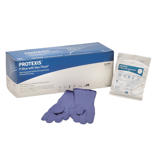 Protexis™ PI Blue with Neu-Thera® surgical powder-free gloves are a synthetic solution that can be worn as a foundation layer when double-gloving. The blue color alerts wearers to breaches in the outer glove and the Neu-Thera® emollient coating enhances don ability as well as protecting, restoring, moisturizing and soothing hands during glove wear. These double-gloving foundations have been designed for maximum safety and comfort. The blue color acts as a warning signal for breaches in the outer glove, while Neu-Thera® emollient coating helps protect and rejuvenate hands, leaving them moisturized and soothed after wear.
