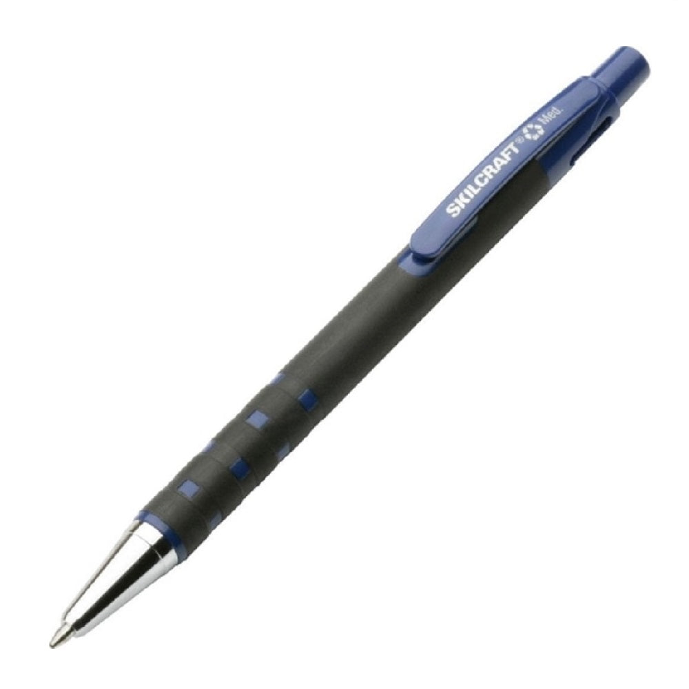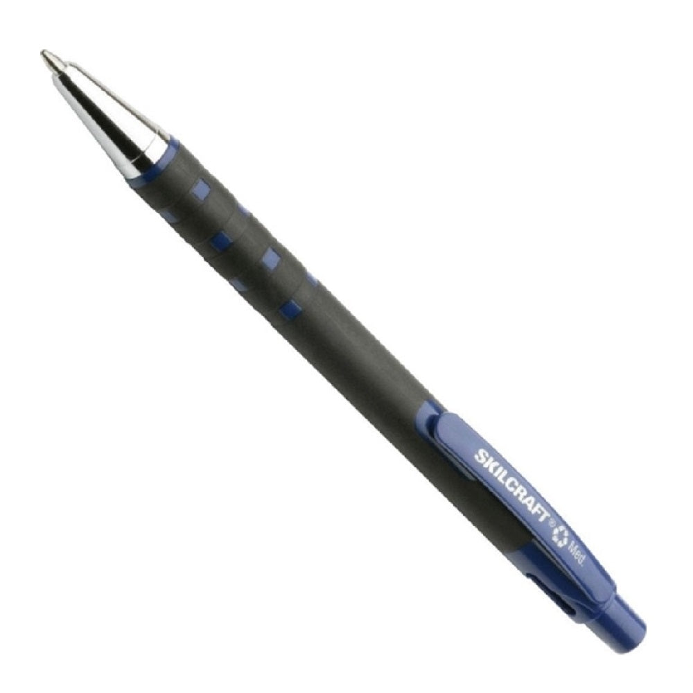 Enjoy Skilcraft® quality in this redesigned, retractable and refillable pen with a non-slip, rubberized grip for added comfort and control. Made of 55% post-consumer materials with 55% total recycled content and smooth writing ink that writes without fading, smears, or smudges.