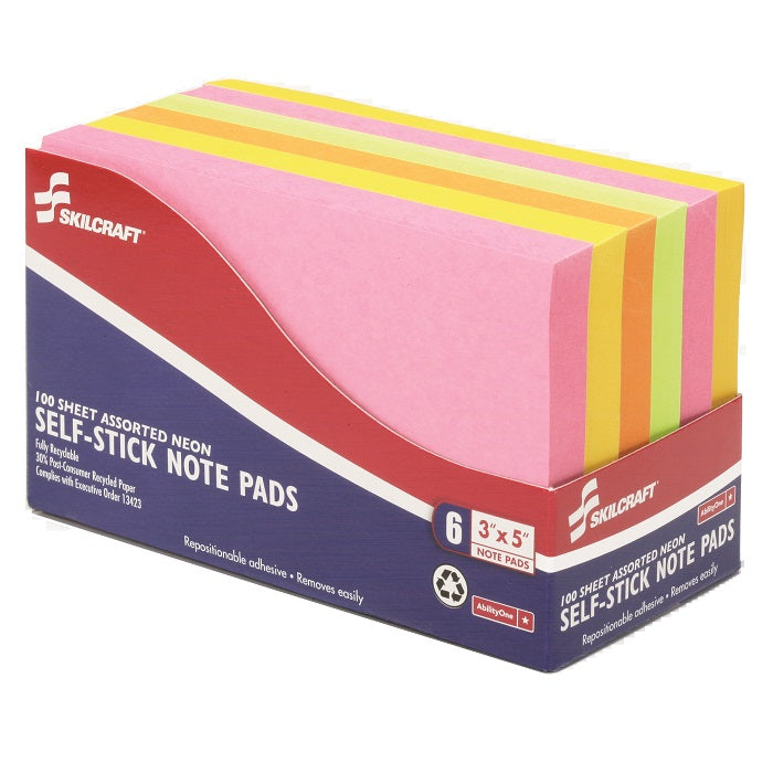 Easy to spot and indispensable in the office. Skilcraft® Neon self-stick notes in assorted colors have an adhesive backing that allows each sheet to be attached to almost any surface and removed without leaving a mark. Perfect for leaving eye-catching notes in otherwise hard-to-spot places. Made from recycled paper with post-consumer content using quality 3M materials.
