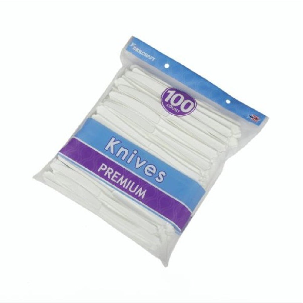 SKILCRAFT® Type III plastic knives deliver reliable single-use performance for cafeterias, catering, and breakrooms. The premium material is heat tolerant and meets FDA requirements. Each knife is individually sealed for hygiene; 100 per pack for efficient stocking and distribution.