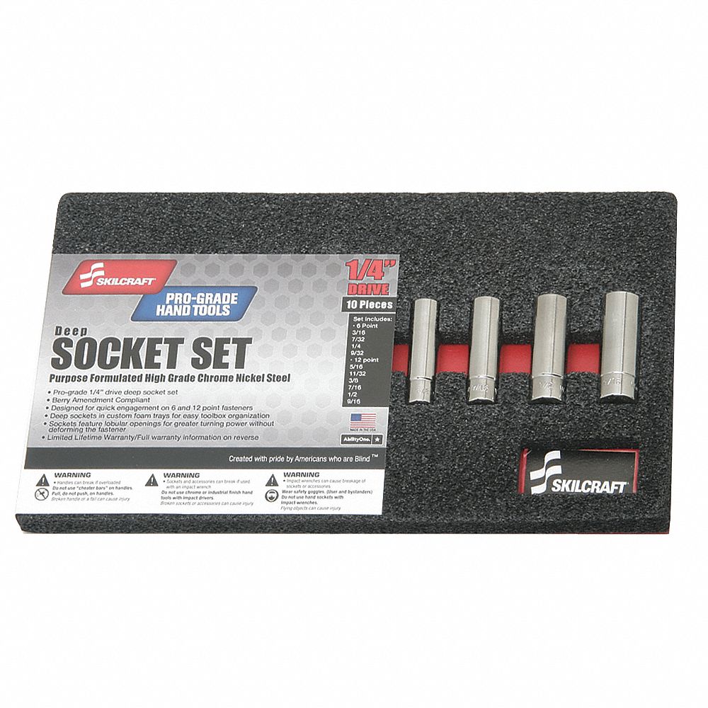 5120014293625 AbilityOne NSN4293625 Socket Set, 1/4 Drive Deep, SAE 6 and 12 Point Fasteners, 10 Pieces SE