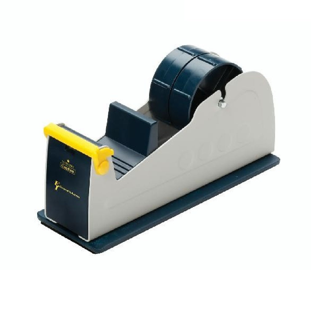 Tape dispenser with two 1" wide tape rollers. Rollers are 3" in diameter (takes a 3" core tape) and rotate independently. Unit takes two 1" wide rolls or one 2" wide roll. Unit has a heavily weighted and padded base for stability. Unit has a full 2" wide cutter blade with a protective guard. Tape dispenser with two 1" wide tape rollers
